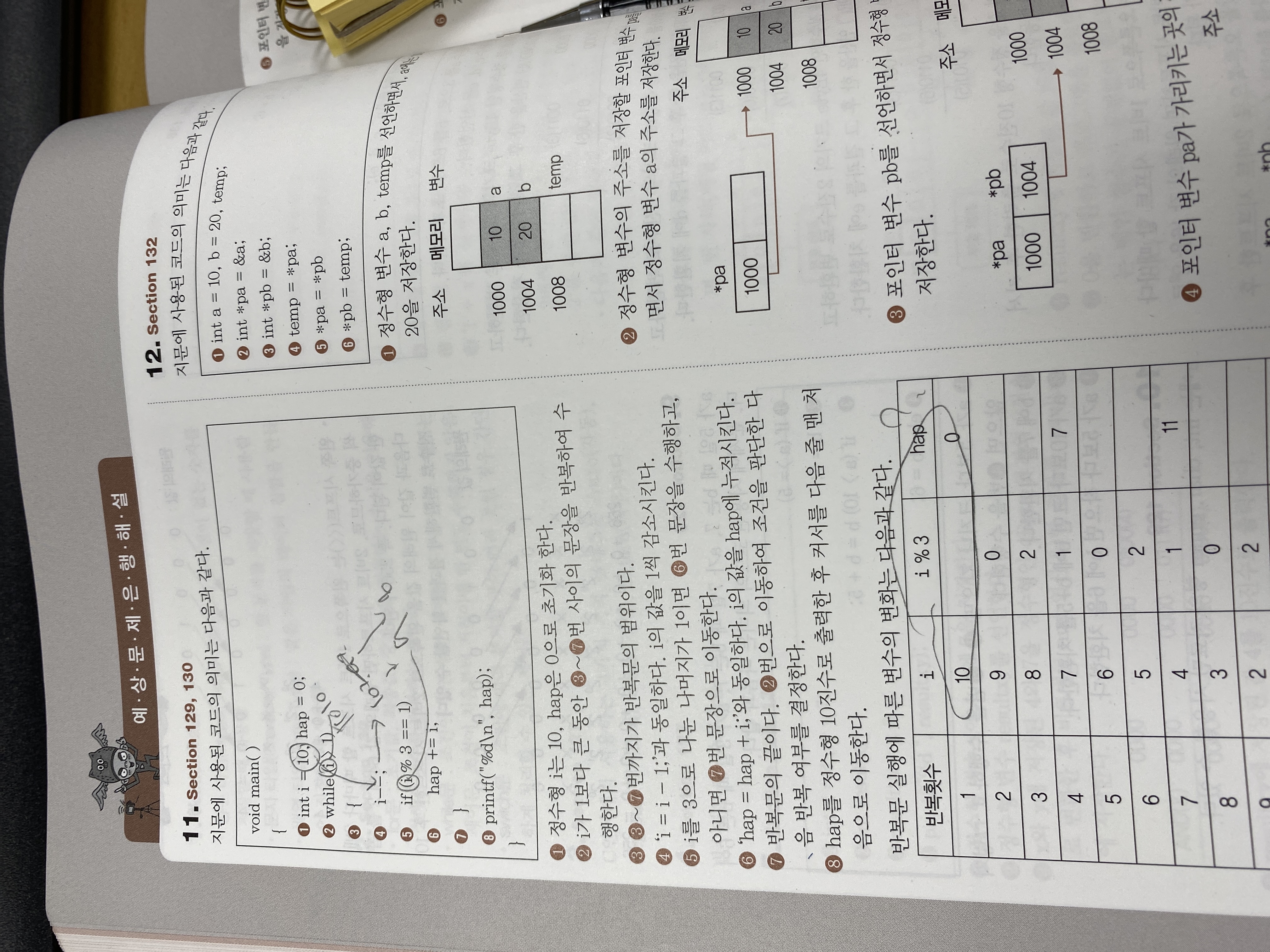 왜 첫번째 반복횟수에 i에 10이 들어가면 해설 4번째 줄에 의해서 9가 되나요 아님 10인가요 10이면 5번줄에 i%3하면 나머지가 1인데 왜 hap+=i; 실행을 안하죠?