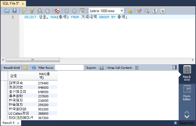 이 때 상호와 max를 조회하게 되면, 하나의 튜플만이 존재하니 각 튜플들은 자기 튜플의 총액을, 효신제조업과 한영산업은 더 위쪽에 배치된 '효신제조업'과 공통 총액인 648000이 뜨게 됩니다.