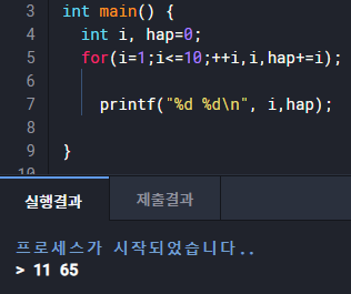 이 때 i는 1부터 11까지 변화하고, hap은 1~10까지 더해 55의 결과를 내겠죠.