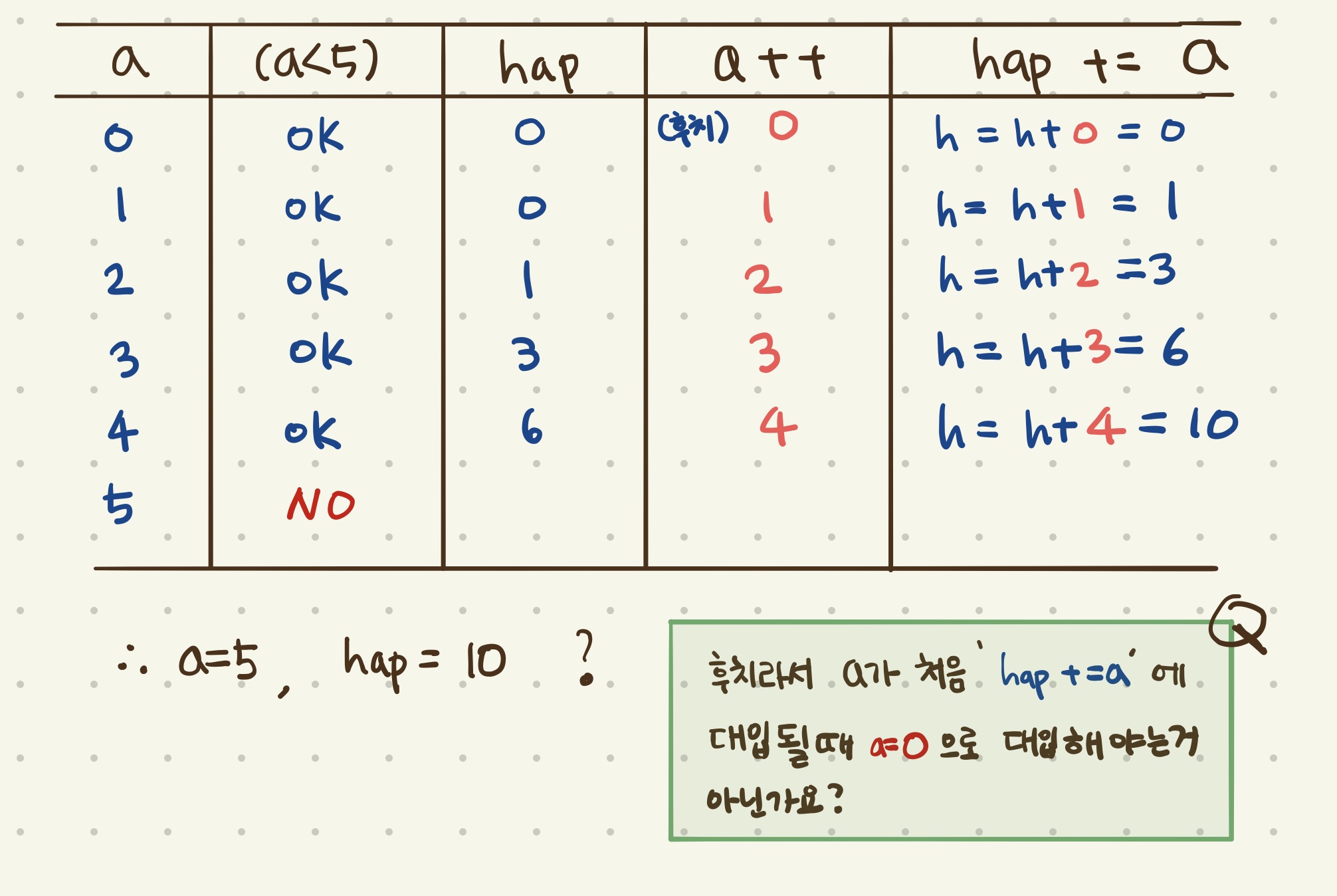 따라서 3번에서는 단순히 a 값이 1 증가하게 되고, 4번에서는 증가한 a의 값이 hap에 더해지게 되죠.