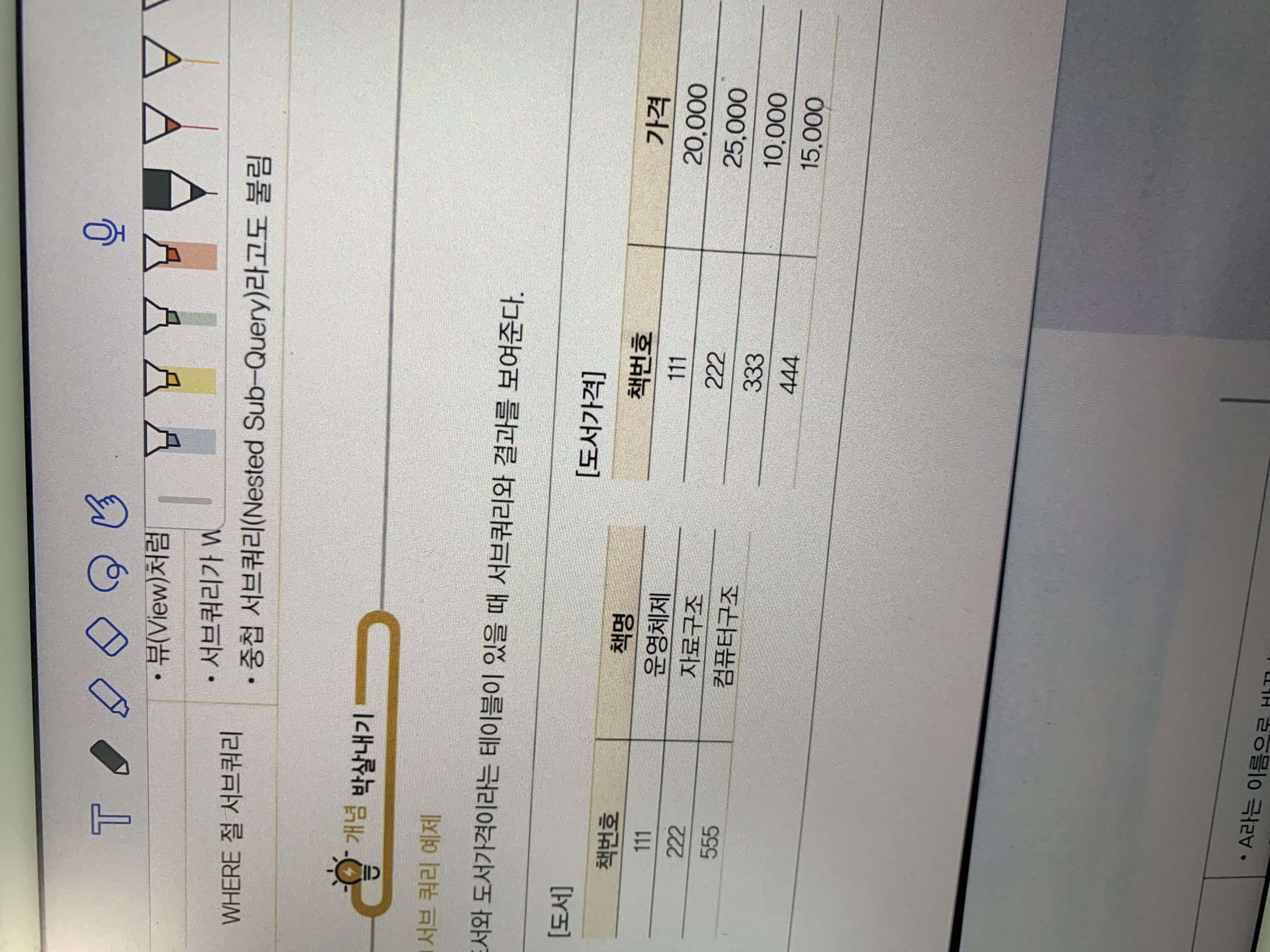 (selete 책번호 from 도서 where 책명 = '자료구조') B