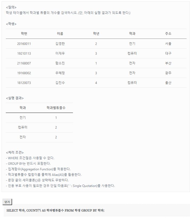 select 학과, count(학과) as 학과별튜플수 from 학생 group by 학과;