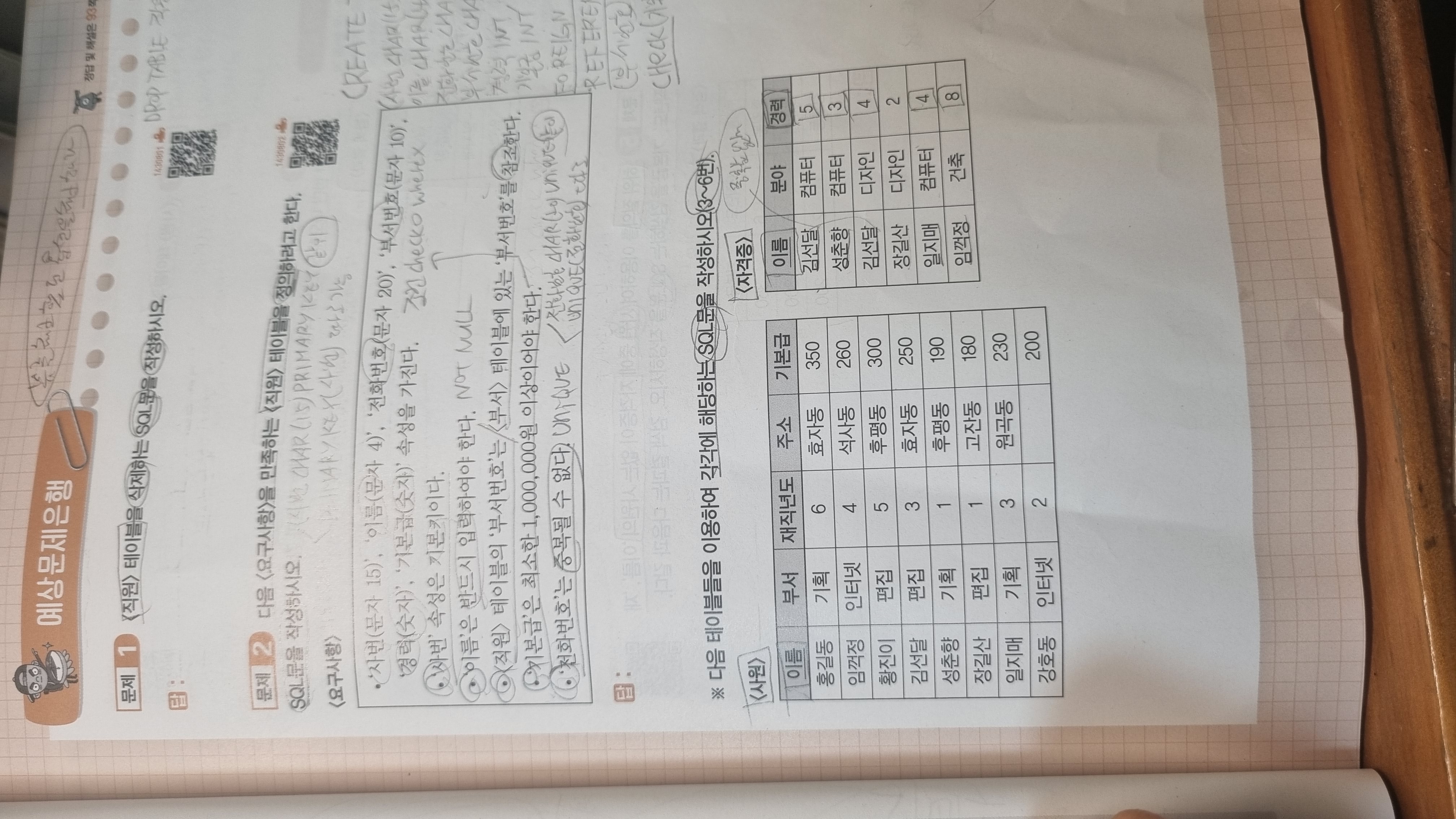 사번은 문자 15자리고 해라. 사번(문자 15) 이렇게 문제가 나오면 char을 쓰면 되고
