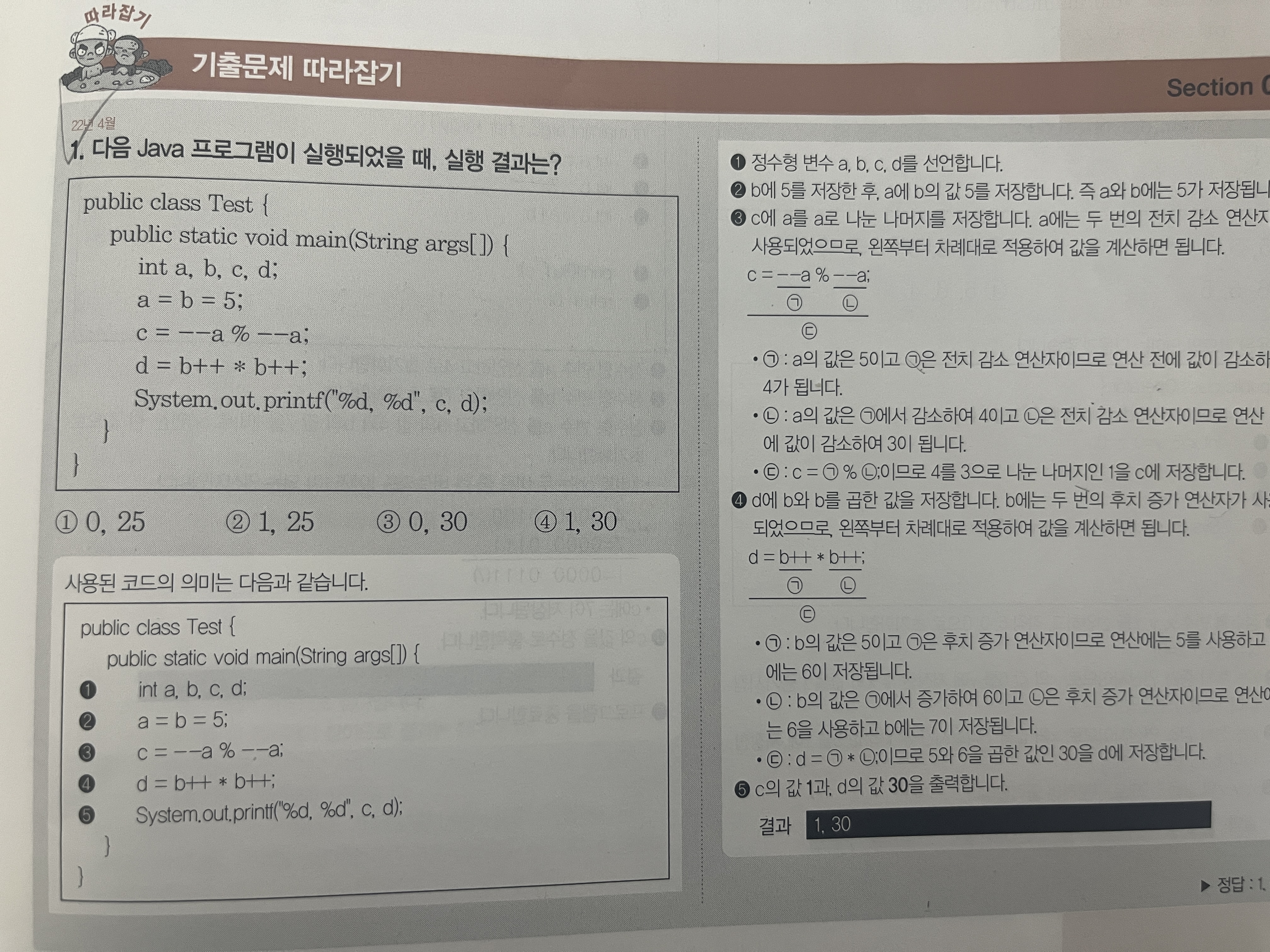 이에 따라 --a % --a가 있는 경우 앞의 항인 --a에 따라 앞의 항은 4로, 뒤의 항은 3으로 계산되어 나머지인 1이 c에 저장되고,
