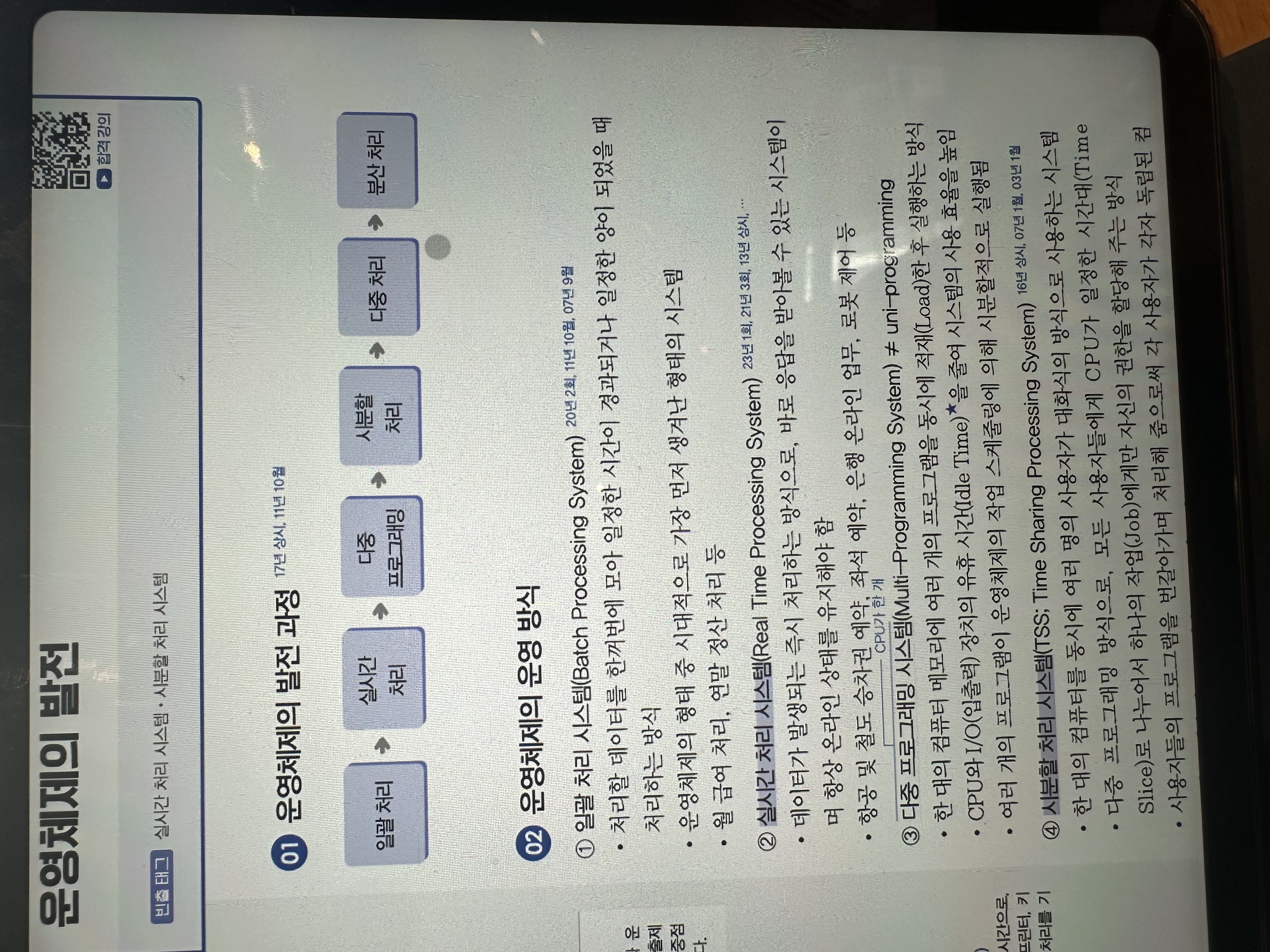 타 교재에서 운영체제 발전과정은 배치-실시간-다중프로그래밍-시분할-다중처리-분산처리 순서로 나타나있는데 시나공 실기서의 운영체제 운용기법 발달 과정은 순서가 다른것을 발견했습니다. 운영체제 발전과정과 운영체제 운용 기법의 발달 과정은 다른것인가요?