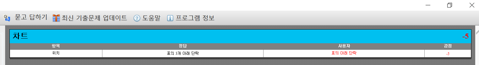 그리고 마지막으로 제가 19회 모의고사를 하고 나서 채점프로그램을 돌렸는데요! 문제에서는 차트를 표의 아래단락에 위치시키라해서 잘라냈다가 표 밑에 붙여넣었는데 채점프로그램에서는 첨부한 사진에서와 같이 표의 3개 아래 단락이 정답이라고 나옵니다. 이것은 무엇이 잘못된건가요??