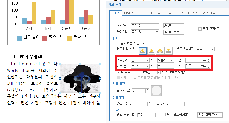 해당 문제(실전 7회)에서 그림 옆의 첫 행은 '는 대부분의 기관이 1대'이며 이 중 가운데 부분에 커서를 놓고 그림을 붙여넣기 하는 것이 좋습니다.