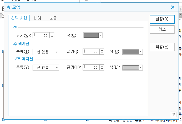 참고로 저는 X축은 왼쪽 끝 부분을, Y축은 위쪽 끝 부분을 클릭하여 속성 창을 호출합니다.