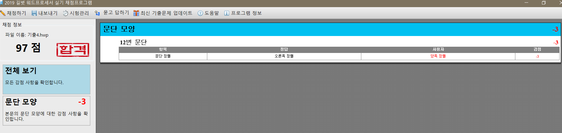 채점프로그램을 사용하면서 문단 모양의 '12번 문단' 정렬을 틀렸다고 하는데