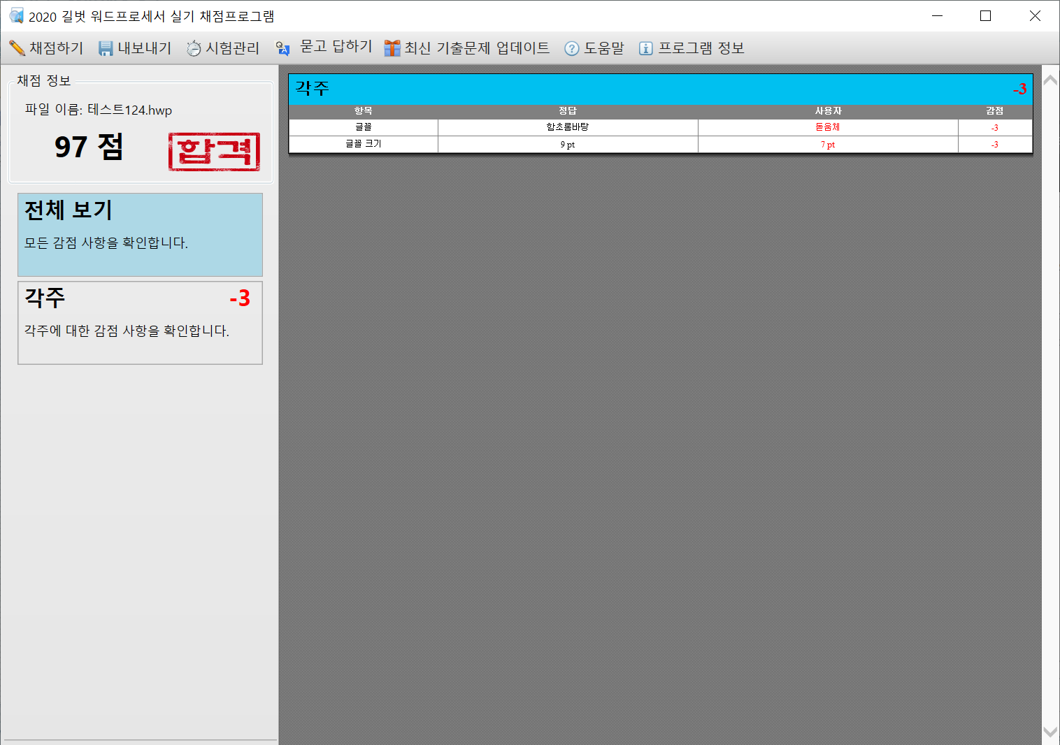 <세부 지시사항> 쪽과 실기 채점 프로그램과 내용이 일부 다른 점을 찾았습니다.