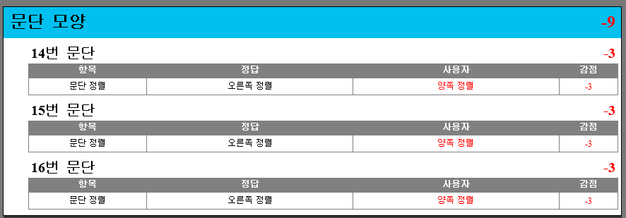 워드 실기 채점 프로그램에서 14문단 15문단 16문단 오른쪽 정열이라고 되어있는데