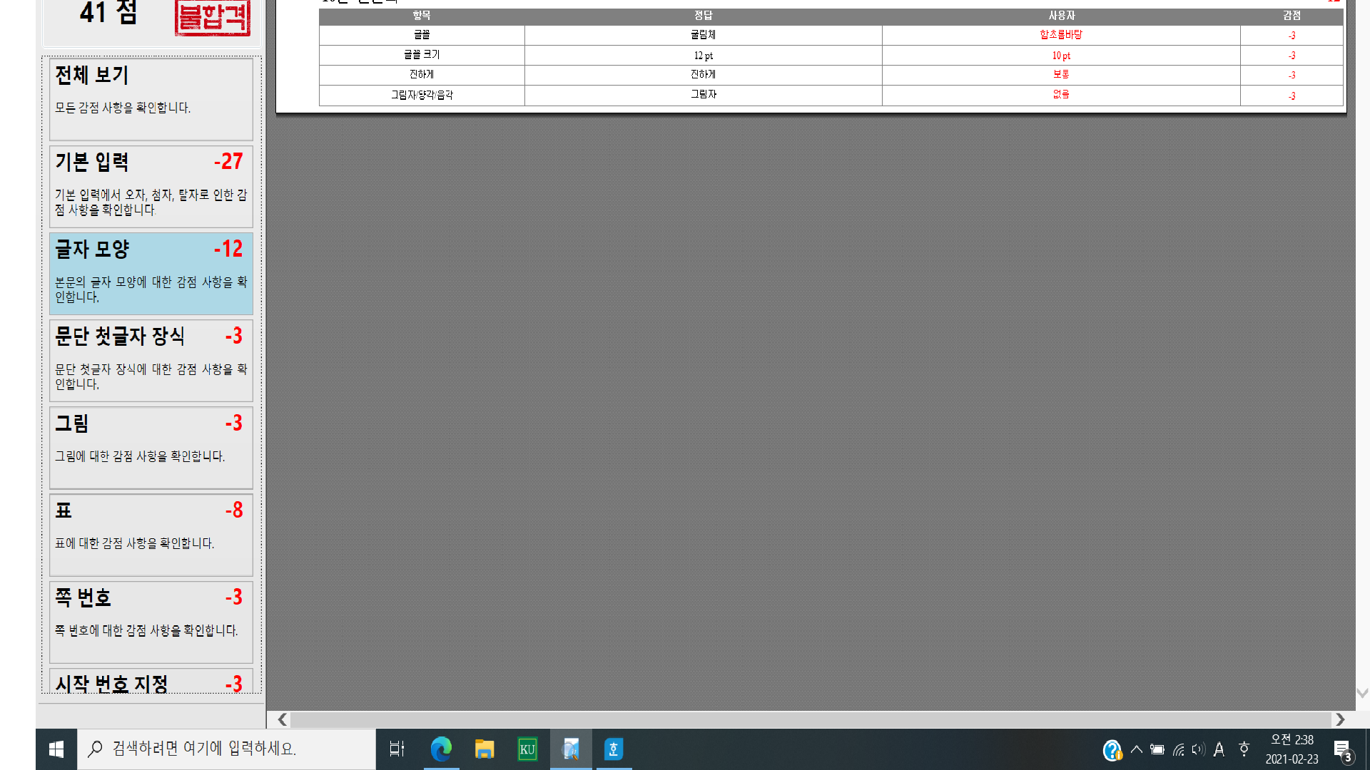 1. 워드 실기의 특성상 표는 직접 작성하신 한글 파일을 확인해야 정확한 원인을 파악할 수 있고, 거기에 대한 정확한 답변을 드릴 수 있습니다.