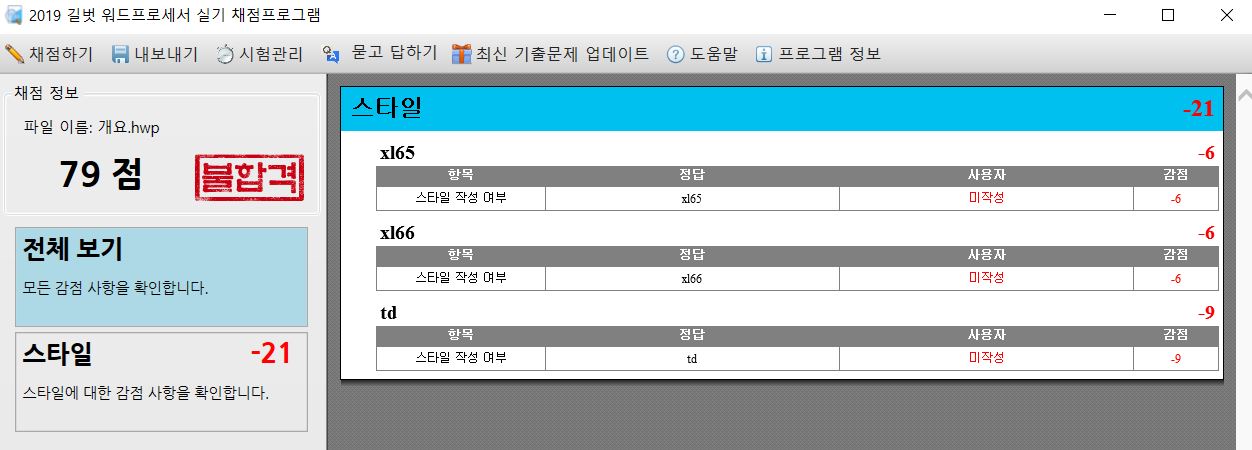 첨부한 그림의 스타일(xl65, xl66, td)은 회원님의 한글 프로그램과 정답 파일이 작성된 한글 프로그램 간 버전이 다른 경우 발생하는 감점으로 해당 감점은 무시하셔도 좋습니다.