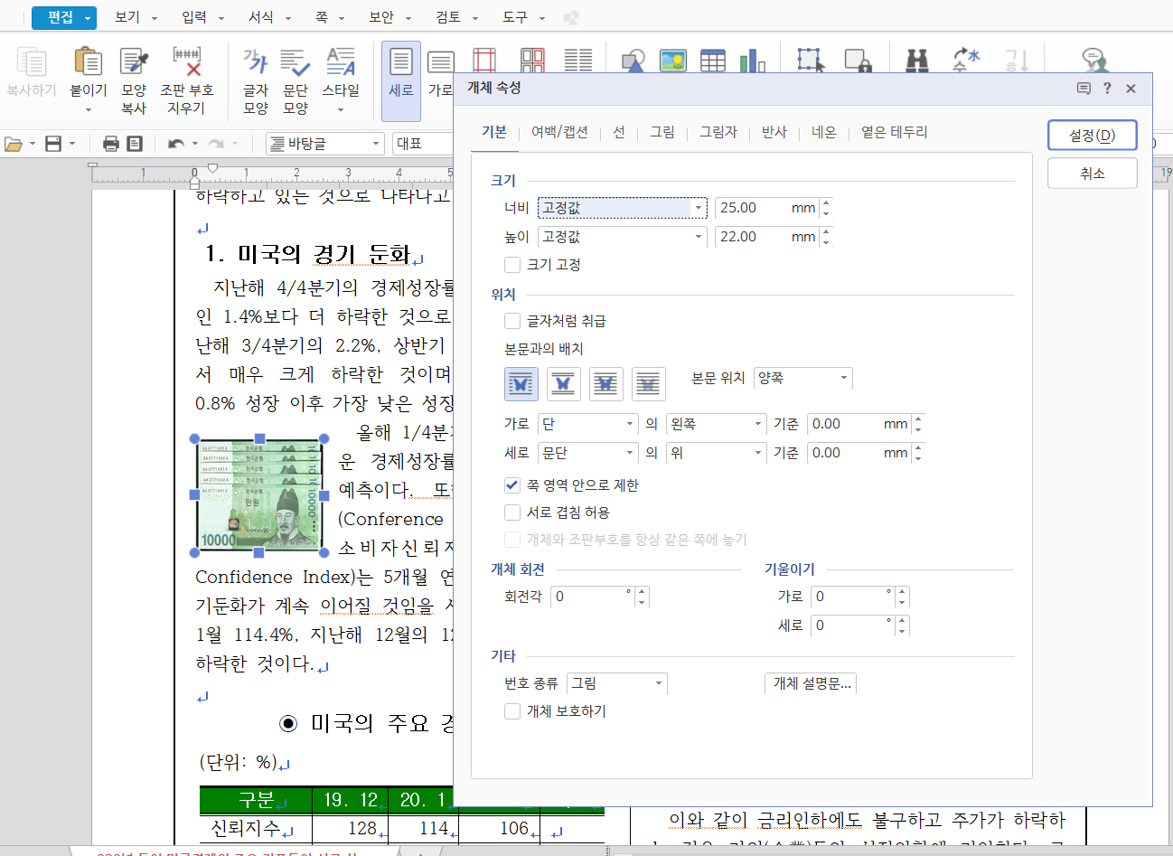 첨부한 파일처럼 그림을 삽입하고 개체 속성을 지정했을 때 그림의 위치가 문제지와 다를 경우 다음과 같은 방법으로 그림의 위치를 이동시켜 주면 됩니다.