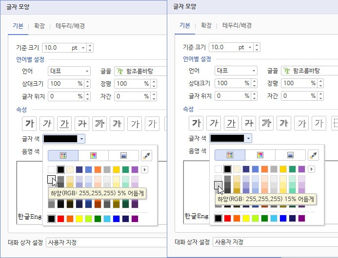 또한 하양의 하위 색상에는 '하양 5% 어둡게'와 '하양 15% 어둡게'가 있지만 '하양 10% 어둡게'는 없습니다.