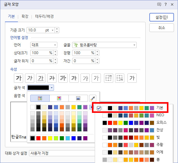 한글 버전에 따라 하위 색상이 다를 수 있으므로 다시 시험에 응시할 경우 '하양' 관련 색상은 '기본' 테마에서 찾아서 선택하세요.