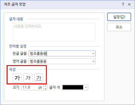 '보통 모양'은 차트의 제목, X축, Y축, 범례의 글자 모양 대화상자에서 속성 3가지가 아래 그림처럼 모두 해제된 상태를 의미합니다. 즉, 아무것도 지정하지 않은 기본값을 의미하므로, 글꼴 크기만 지정하셨다면 올바로 지정하셨습니다.