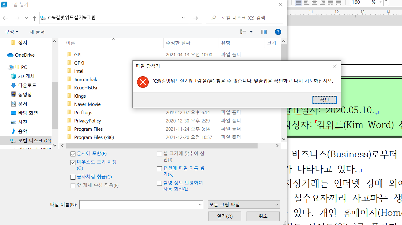 WP 폴더가 존재하지 않습니다 C:\길벗워드실기\그림 으로 찾아봐도 없구요.