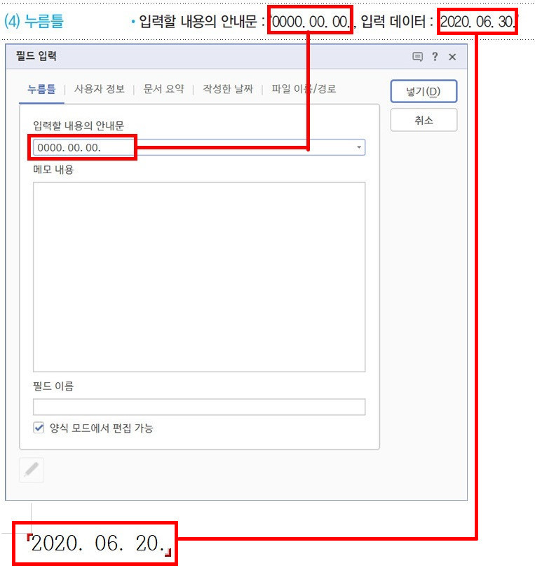 현재 만들어져 있는 누름틀을 삭제하고, 아래 그림처럼 '필드 입력' 대화상자에 0000. 00. 00.으로 입력하고 누름틀을 만들고 만들어진 누름틀 안에 '2020. 08. 10.'을 입력하세요.