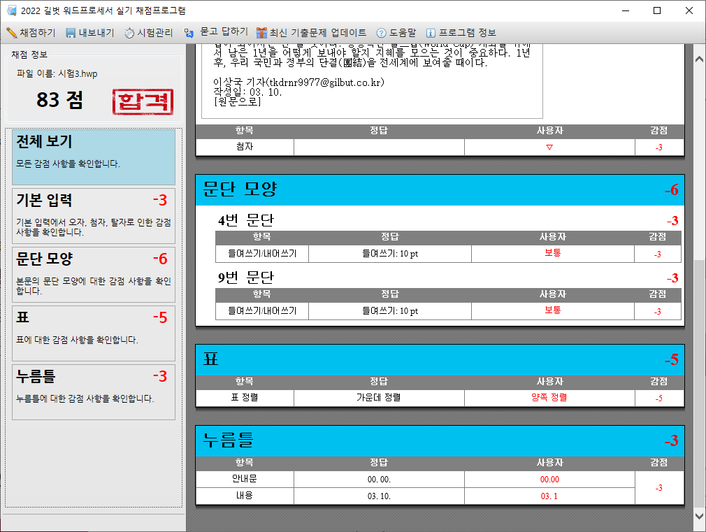 2. 워드 실기 특성 상 들여쓰기의 경우 회원님께서 작성한 한글 파일을 확인해야 어느 부분이 잘못되었는지 답변을 드릴 수 있습니다.