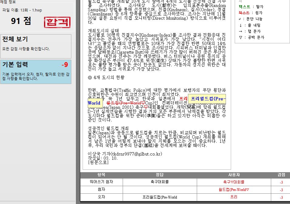 교재 317쪽의 "프리월드컵(Pre....)" 그리고 "축구대회를" 여기에서 띄어쓰기해서 입력했더니 감점이 되었습니다.