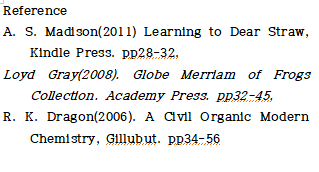 Loyd로 시작하는 두번째 참고 문헌에 기울기가 되어 있는 Globe Merriam of Frogs Collection. 부분만 드래그 한 뒤에 스타일 기능에 참고문헌 2라는 이름으로 이 부분에만 스타일을 적용했는데 드래그 한 Globe Merriam of Frogs Collection. 부분 뿐만 아니라 전체 부분인 Loyd Gray(2008). Globe Merriam of Frogs Collection. Academy Press. pp32-45. 이 전부 다 참고문헌 1 스타일이 아닌 기울기를 설정한 참고문헌 2 스타일로 적용이 되어서 위 문장에 모두 기울기가 적용되었습니다.