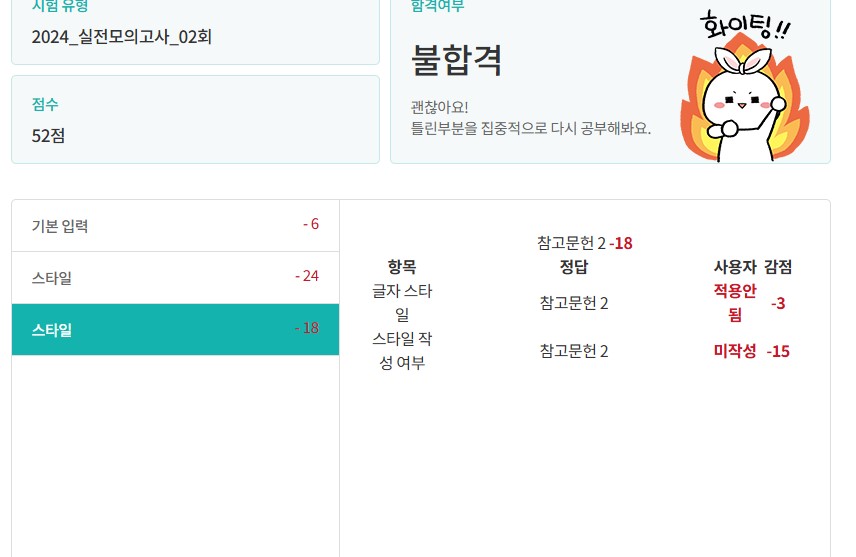 안녕하세요 실전모의고사 기본입력에 탈자,첨자 -6점스타일 참고문헌1,2 둘다 작성하고 적용했는데 -24, -18점이네요