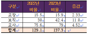 구분이나 증감의 열너비를 줄여 2022년 비율과 2023년 비율이 한줄로 나오게 만들면 됩니다