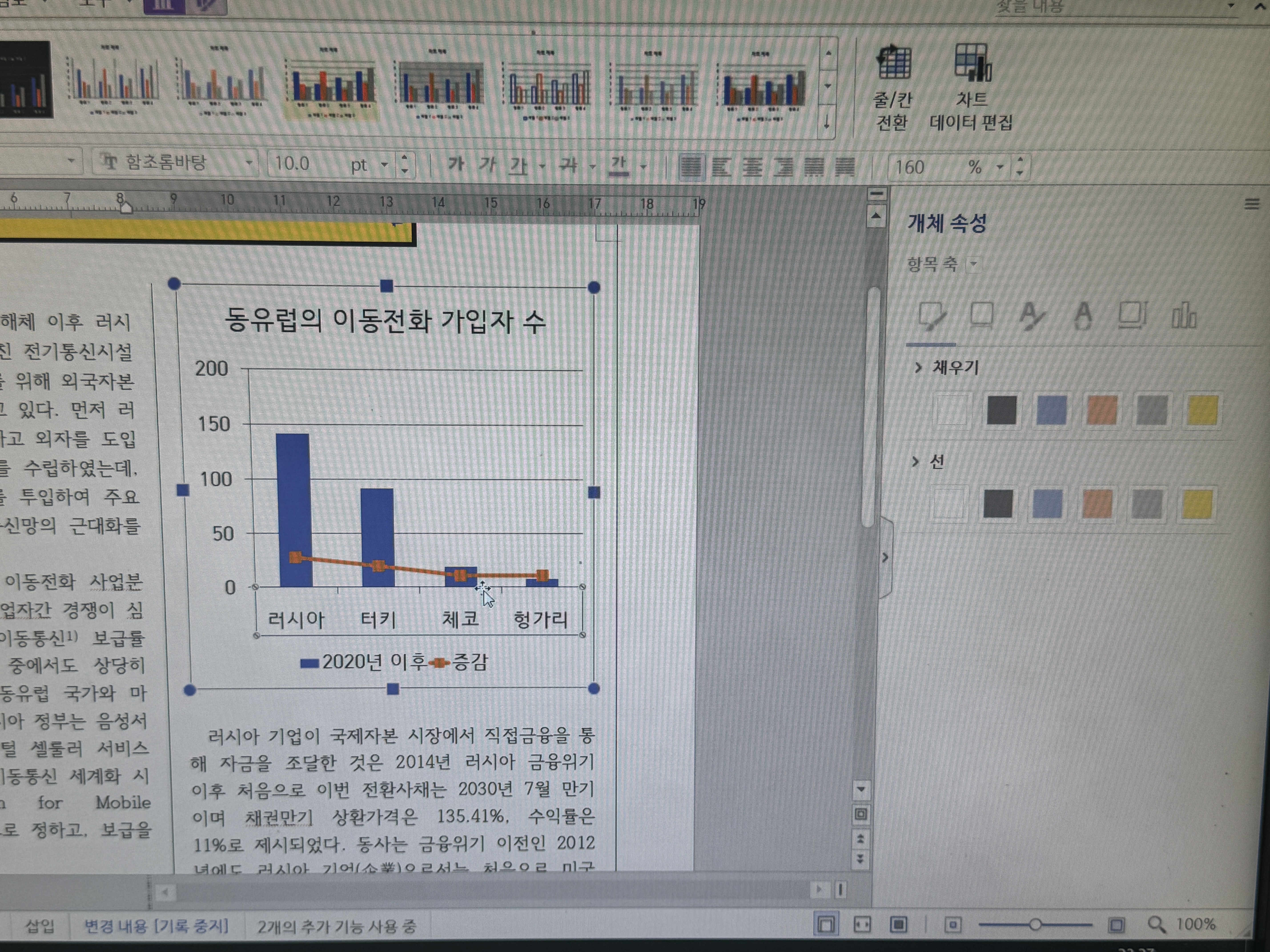 차트에서 다른 부분이 선택되어 '개체 속성'에서 '범례 위치'가 활성화되지 않았을 수 있습니다.