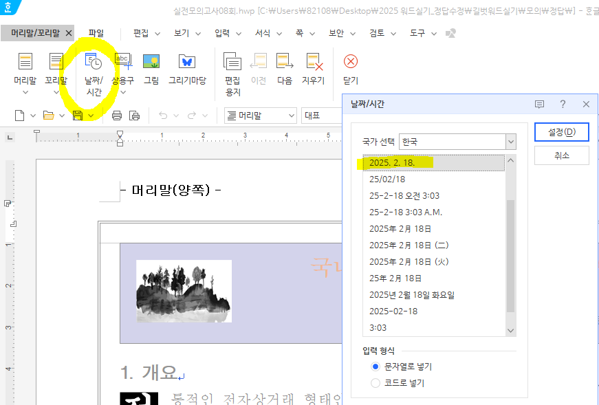 2) 워드 실기 시험은 지시사항에 제시된 내용대로만 지정하면 됩니다. 지시사항에 '날짜/시간' 아이콘을 이용하라는 내용이 있을 경우 해당 아이콘을 눌러 입력해야 하지만 아무런 표시가 없다면 그냥 키보드로 입력해야 합니다.