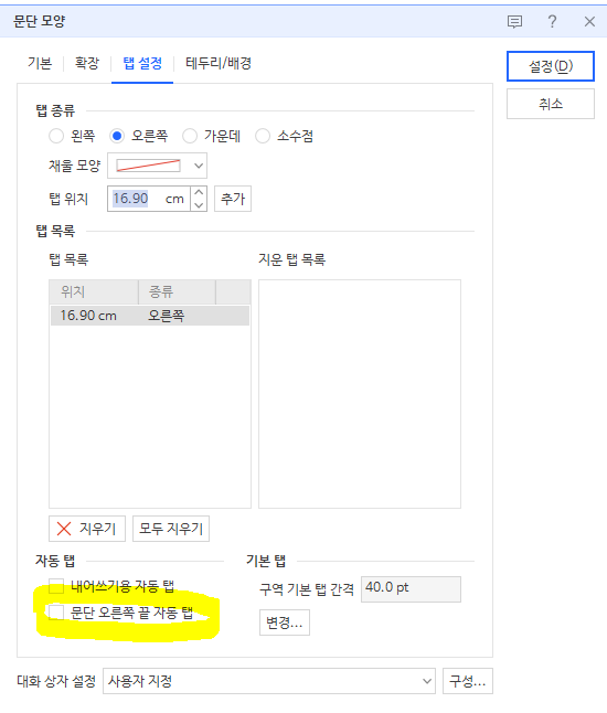 3.탭설정에서 자동탭에서 문단 오른쪽 끝 자동탭 안눌러도 되나요?어디서는 눌러야 된다고 나와서 질문드립니다.