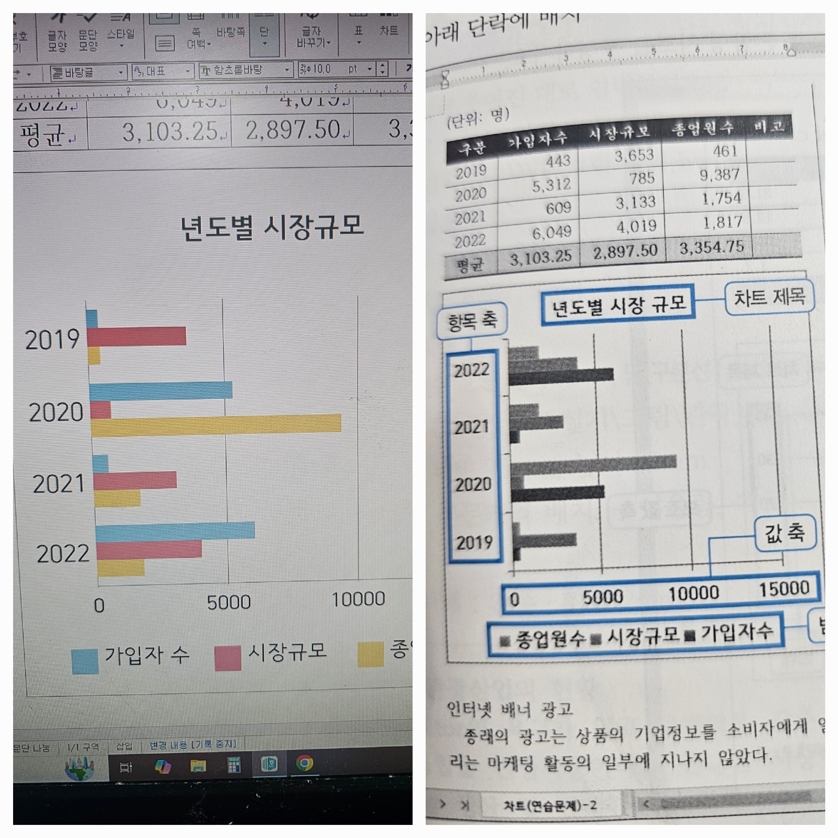 2022~2019로 내림차순인데 제가 차트만들면 맨위가 2019년 도 부터 뜹니다 왜그럴까요 이부분 을 수정하는 건 설명이 나와있지 않습니다. 한글 2024로 공부중인데 차트 쪽은 2022버전과 많이 다르네요 ㅠㅠ 그리고 책과 유투브에서는 차트 뒤에 값축의 세로눈금선이 바로 떠서 따로 작업하는 내용 없던데... 그래서 제가 눈금선을 넣었거든요 시험 볼때 차트에 있는 눈금선도 넣어줘야 하나요 따로 지시사항에는 없었어요