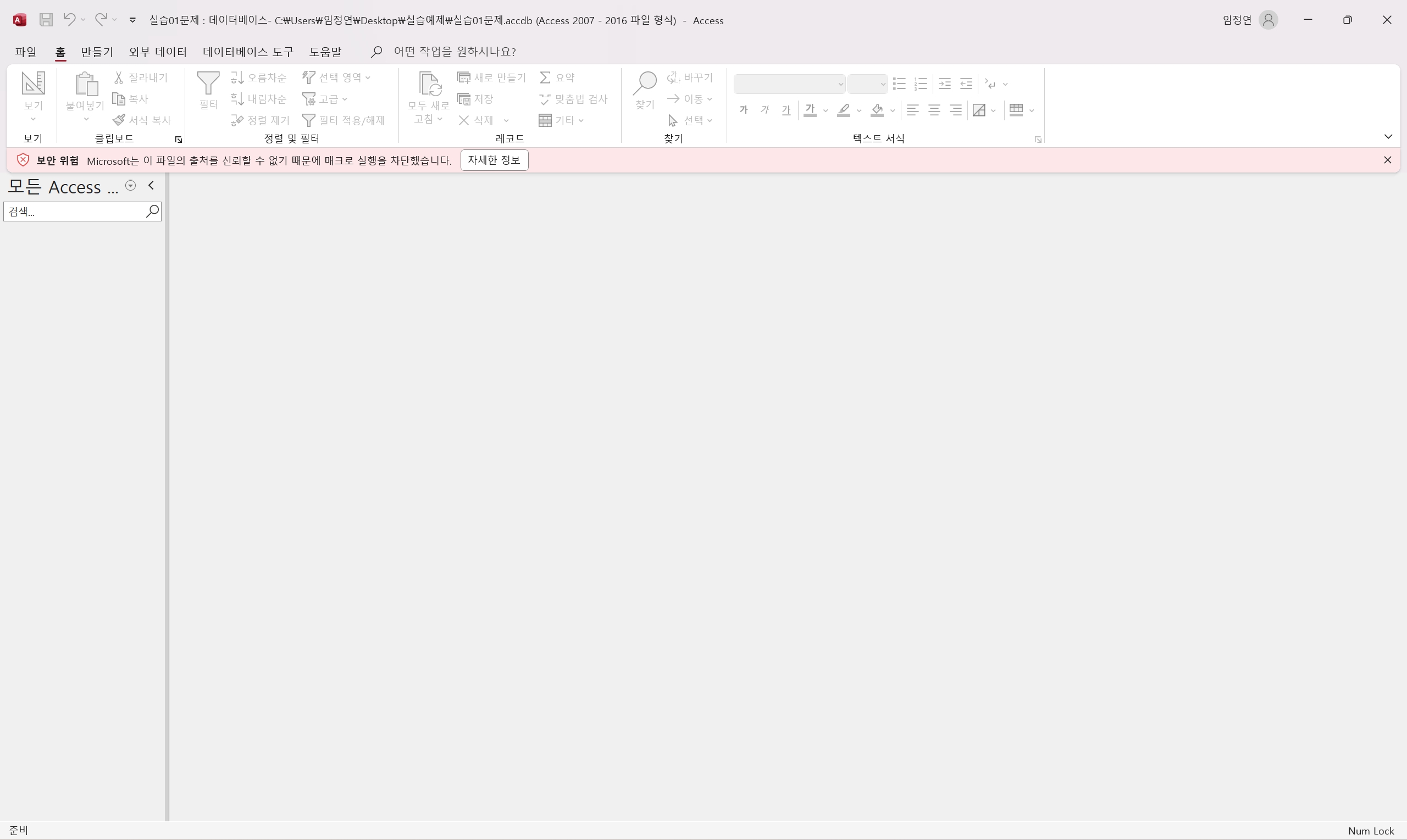 액세스 프로그램에서 [파일]-[옵션]-[보안 센터] 탭에서 [보안 센터 설정]을 클릭한 후 '보안 센터' 창의 [신뢰할 수 있는 위치]에 실습 파일이 있는 위치를 추가해 주세요.