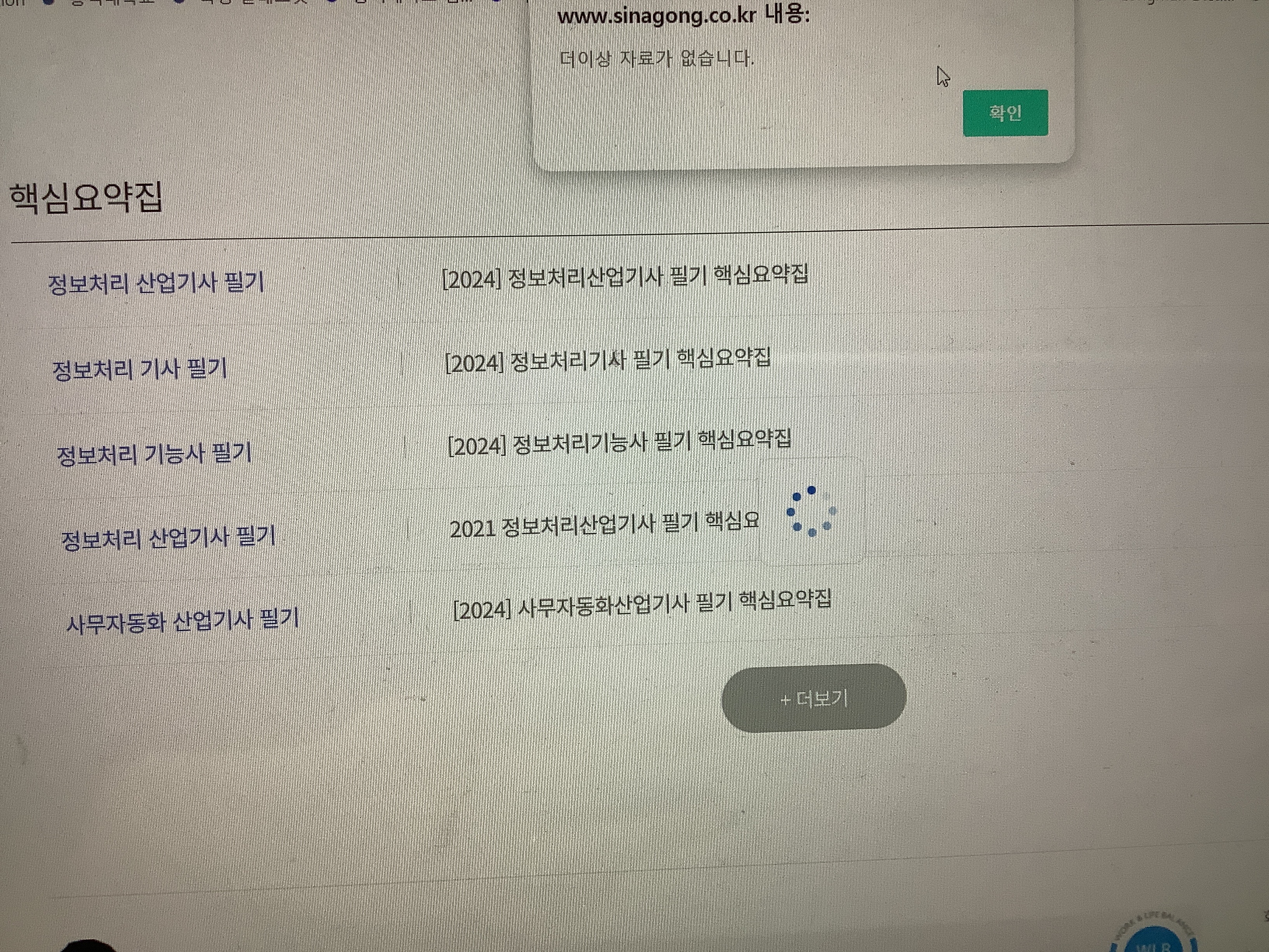 1. 2024년도 컴활 1급 필기 핵심요약본이 [프리미엄존-핵심요약집 메뉴]에 보이지 않고, 더보기를 눌러도 더이상 자료가 없다고 뜹니다.