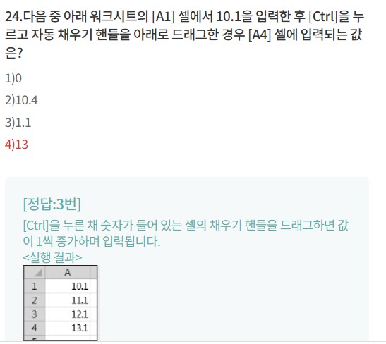 이거 문제 오류 아닌가요?? a1셀 10.1에서 ctrl누르고 채우기핸들 끌면 그림에 나와있는대로