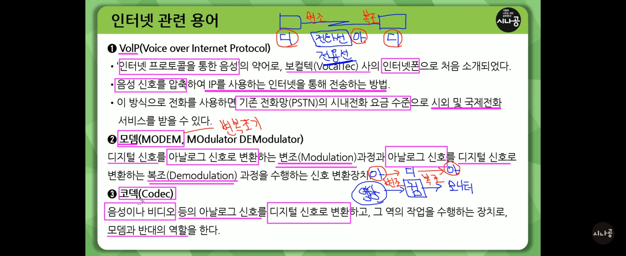 코덱은 모뎀과 반대로 음성이나 비디오 등의 아날로그 신호를 전송에 적합한 디지털 신호로 변환하고, 그 역의 작업을 수행한다는 것을 구분하여 기억해 두세요.