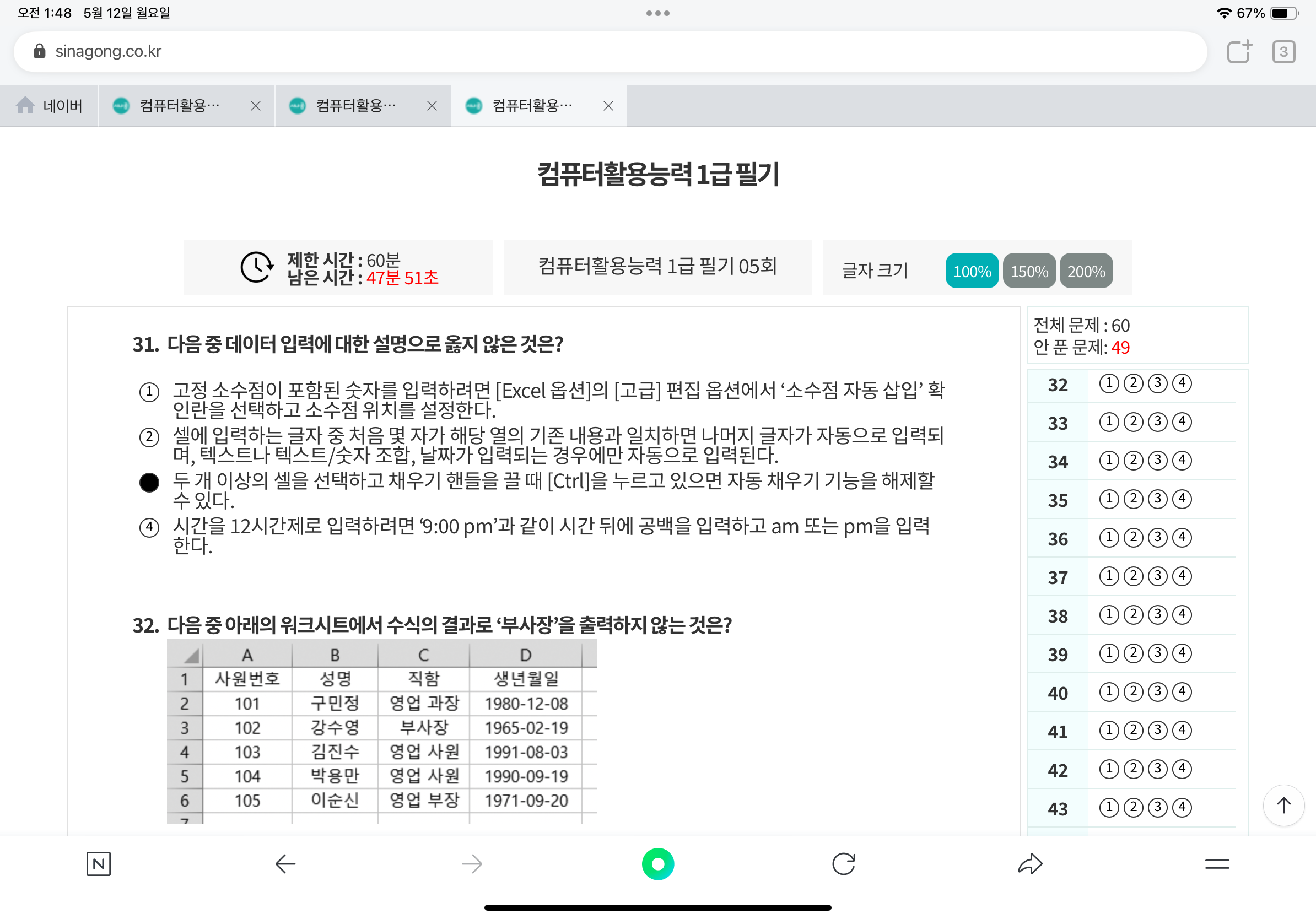 3번 지문에 ‘두 개 이상의 셀을 선택하고 채우기 핸들을 끌 때 [Ctrl]을 누르고 있으면 자동 채우기 기능을 해제할 수 있다‘