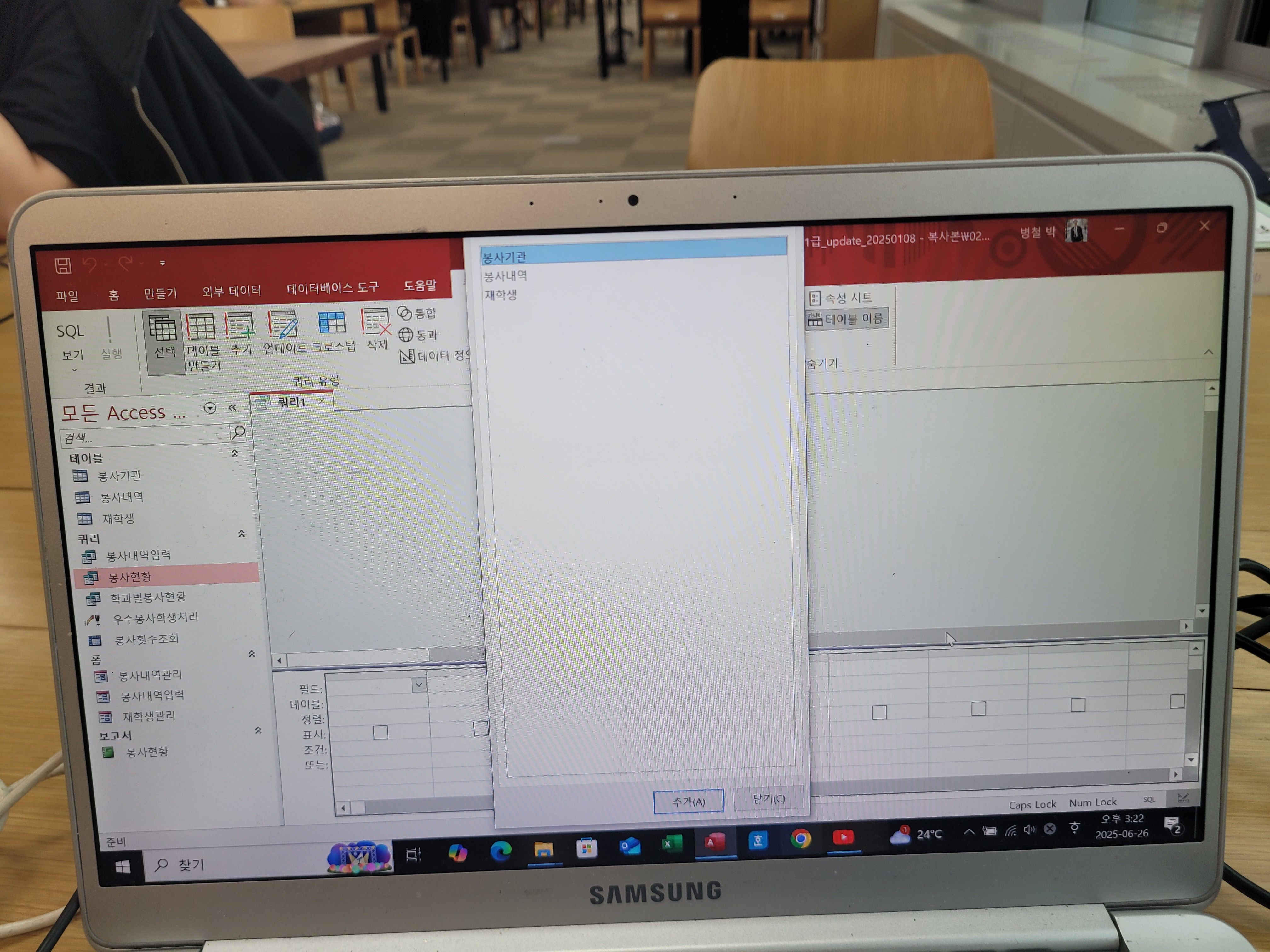 모니터 화면이 작아 잘려써 그러네요. 일반적으로 '테이블 추가'를 클릭하면 표시되는 창에서 '테이블 추가'라고 표시된 부분을 드래그해야 창의 위치를 이동할 수 있는데 보이지 않아 이동할 수가 없네요. 노트북이 아닌 컴퓨터에서 실습해 보시기 바랍니다.