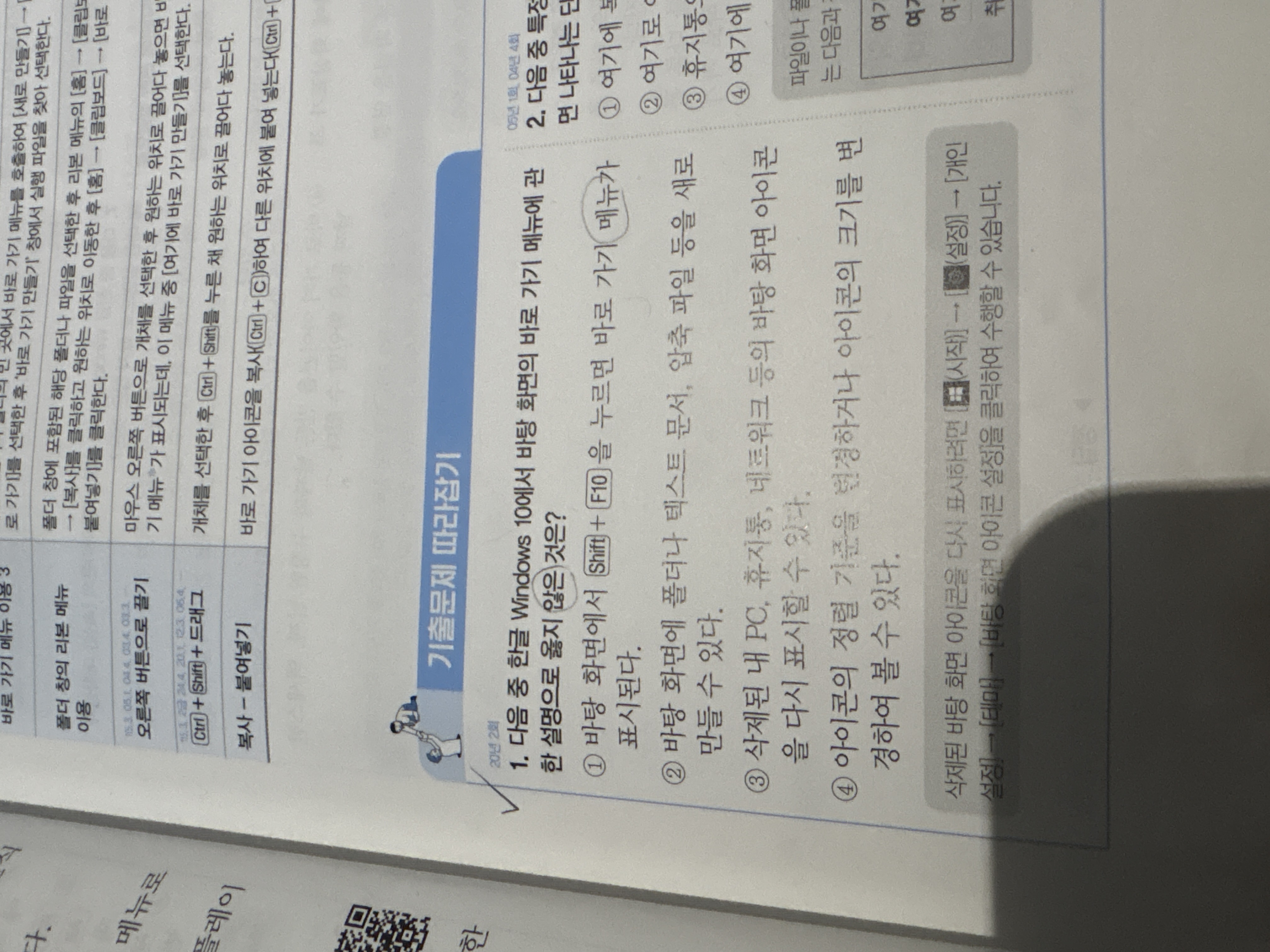 문제는 바탕 화면에서 마우스 오른쪽 버튼을 클릭하면 표시되는 [바로 가기] 메뉴를 이용해 수행할 수 있는 작업을 묻는 문제입니다.