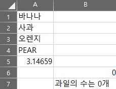 =TEXT(SUM(IF(ISTEXT(A1:A5),1,0)),"과일의 수는 0개")