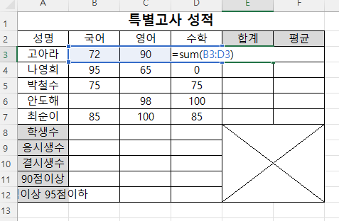 여기서 합계 쪽 에다가 =sum(B3:D3) 쓰는데