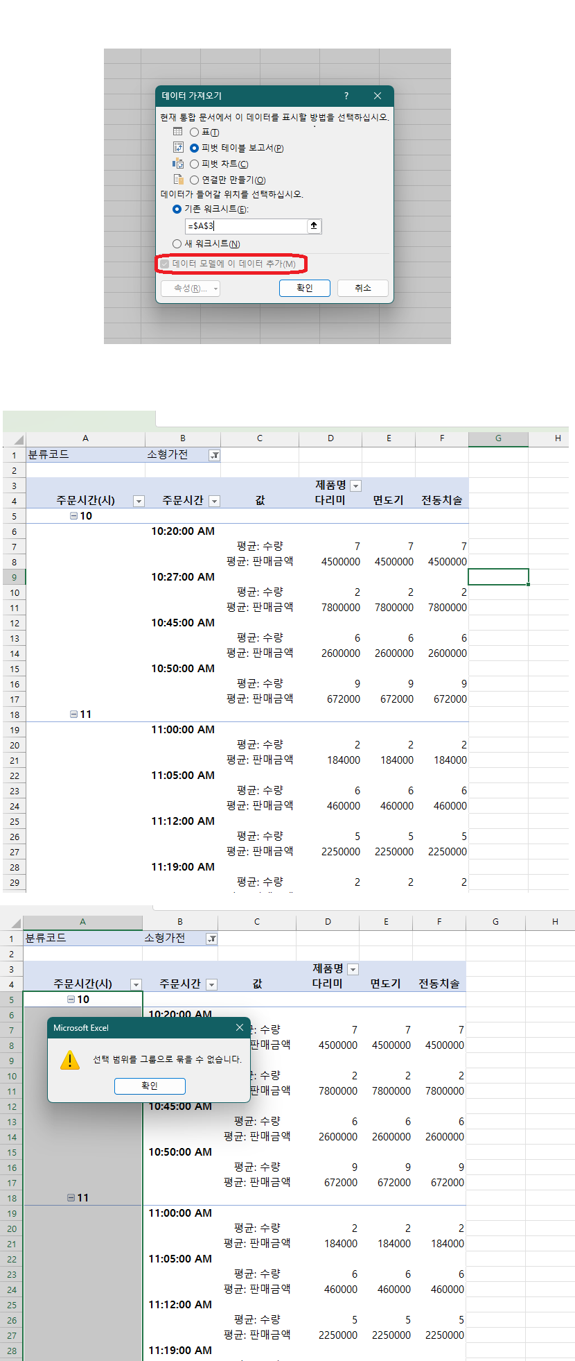 "데이터 모델에 이 데이터 추가 옵션"이 강제로 설정되어서 그런지