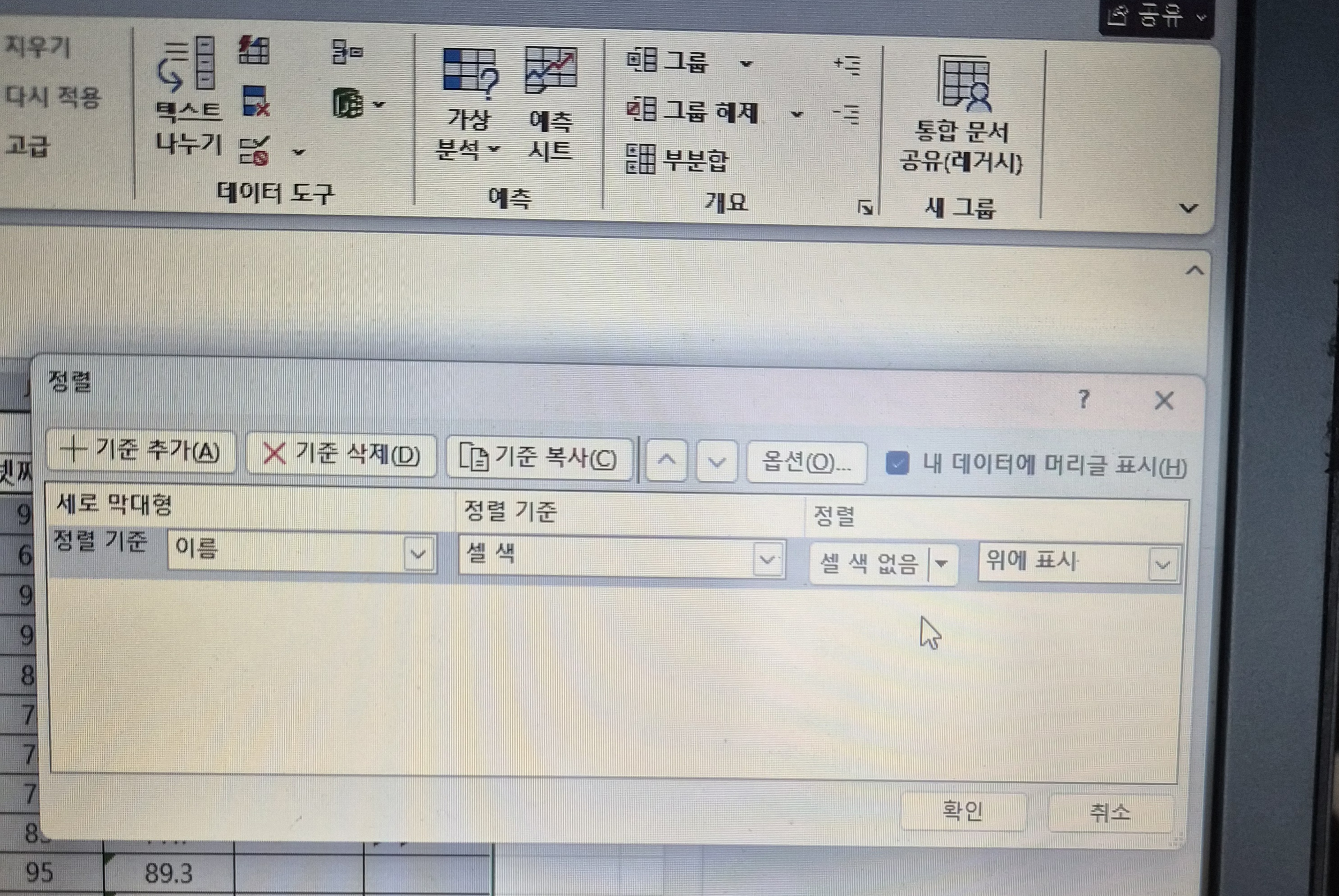 정렬기준을 셀색으로 지정했는데 셀색없음 글자만 나오고 아무것도 안나옵니다