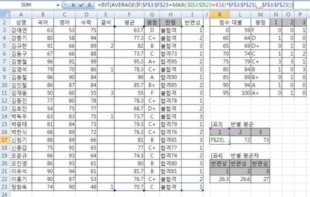 [K17:M17]영역에 반별 평균(F3:F23)을 계산하되 반별 최고 평균점수를 제외한 평균의 반별 평균을 표시하라는 문제입니다.