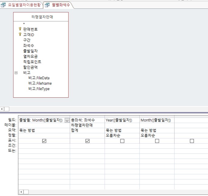 '하행열차판매' 테이블을 이용해 월별좌석수 쿼리를 만든다고 할 때,