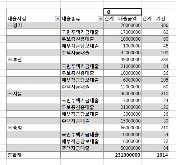 정답은 첫번째 사진이고, 두번째 사진은 작업 중인 피벗테이블입니다. 끝까지 작업을 끝내도 <값> 머리글이 없어지지 않습니다.