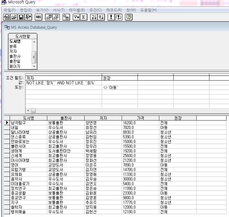 조건을 대입하면 표에서 두번째값(도서명: 내일, 저자:최정선, 권장: 아동)은 제외하고 나와야 할텐데 저는 자꾸 포함이 되서 나옵니다.