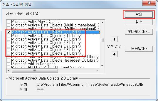 'Microsoft ActiveX Data Objects ~~~ Library' 라는 이름의 항목 중 하나를 체크한 후 <확인>을 클릭하세요.