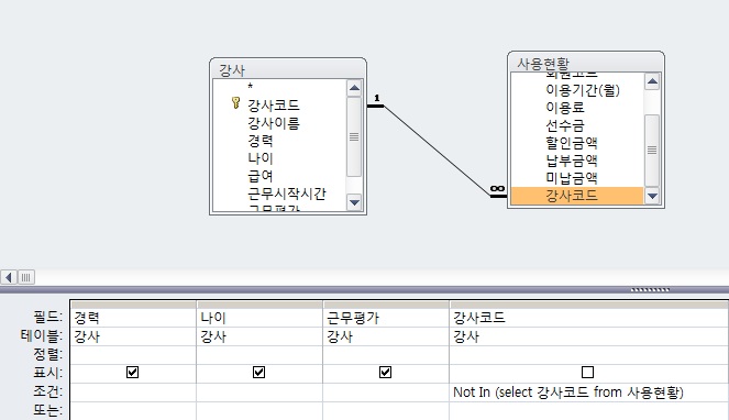 저장된 값은 비교값으로 사용될 수 있습니다. 그래서 '강사코드'를 사용한 것입니다.