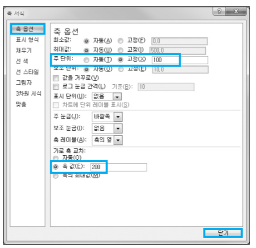 4번 설명에서 '가로 축 교차'를 200으로 설정했습니다. 그림과 같이 지정해 주시면 가로축 항목 위치가 변경됩니다.